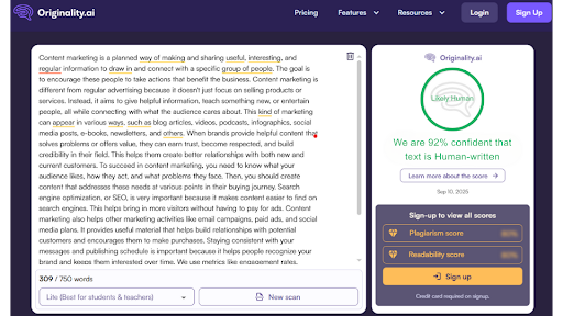 - Detektify Output: Scored 92% Human. Originality.ai is pretty strict in flagging AI similarities. So a 92% result is quite big.