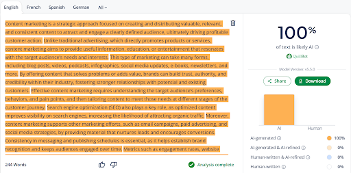 This was my text that I generated with ChatGPT. Before I passed it to any of our tools or by using other AI humanizers, I checked its AI similarity with QuillBot, GPTZero, and originality.ai.